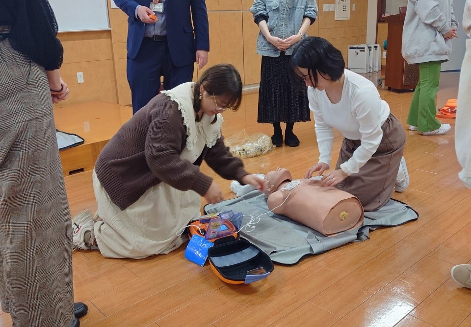 午後の講義ではAED実習を行い、緊急時の対応を学びました。
