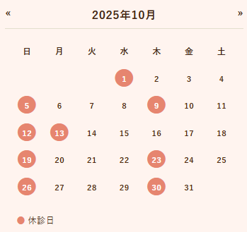 10月診療日のご案内です。完全ご予約制のため、ご来院前には047-421-0118までお電話をお願いします。
