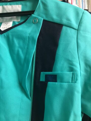 ボックスシルエットの被りタイプだった旧型と比べ、女性らしいやや絞りのあるパターン、そしてフロントファスナーが付くことにより着脱が簡単になり、そのファスナーに沿ってアクセントカラーである差し色が縦に入っているスタイリッシュなデザインが決め手となりました。