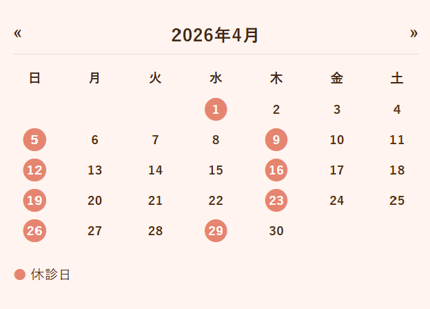 2026年4月診療日のご案内です。29日(水)は昭和の日のため休診となります。当院は完全予約制です。ご来院前に当サイトのWeb予約お問合せフォームまたは047-421-0118までお電話をお願いします。